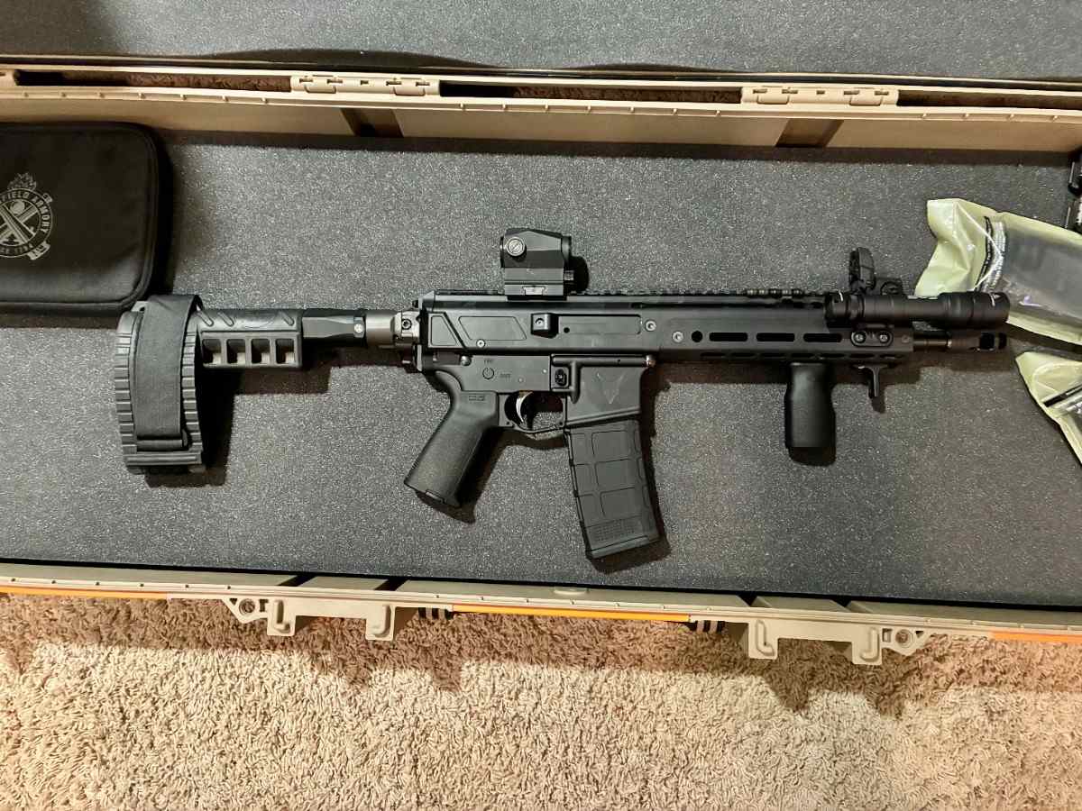 PSA Jackl 5.56 pistol, it comes with a Sig Sauer brace that's foldable, Romeo5X, misc. rail furniture, M-Lok and picatinny grips. Located in Conroe.