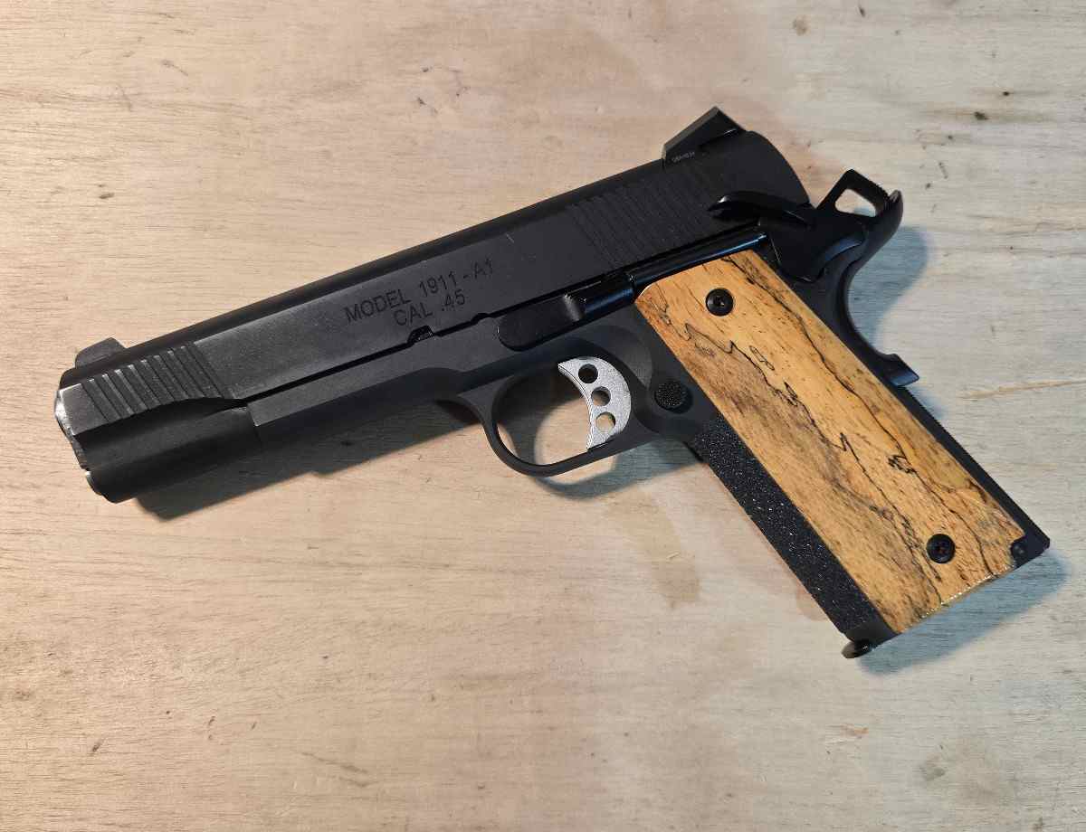 For sale is a lightly used Springfield 1911-A1 Loaded .45 ACP with Tritium night sights. It comes with the box, paperwork, and everything it comes with new, including 2 7-round Springfield magazines plus 3 more 8-round Wilson Combat magazines, and multiple grip options. This model has a phosphate finish, not the painted Cerakote that the Operator has. It currently wears a beautiful set of Fusion Firearms thin grips in White Cocobolo with the Ranger cut. Also included are some VZ grips and the original grips. I've fired about 400 rounds through this, including 50 rounds of Federal HST and it has been completely problem free, and very reliable. It has the factory full-length guide rod, but I prefer GI style, so I bought the parts for it and they are in the box. If you like them you can use them. It has a strip of Talon Grips granulate grip strap on the front strap, but it will peel off if you don't like it.