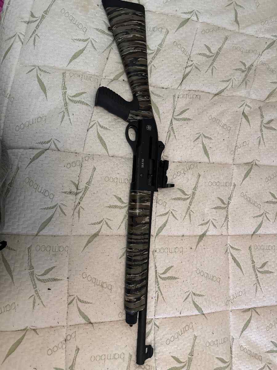 ATA Arms 12-gauge semi-automatic shotgun with camo stock and pistol grip. Reliable and in good working condition. Includes optic rail with red-dot mount and fiber-optic front sight, txt 2819796888 with trades/offers